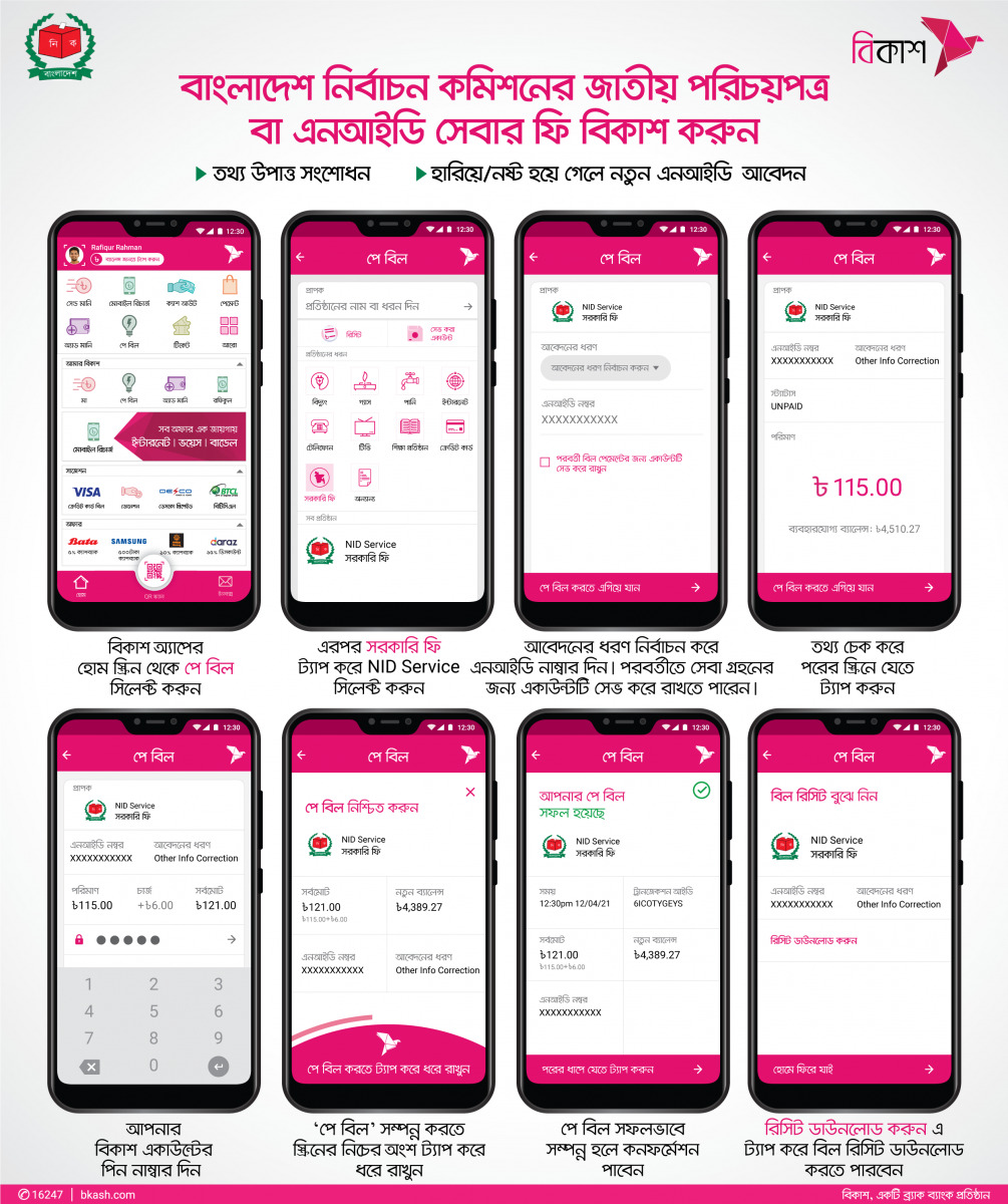 বিকাশ ও ডাচ্-বাংলা এর মাধ্যমে NID-এর ফি প্রদানের নিয়মাবলী।
